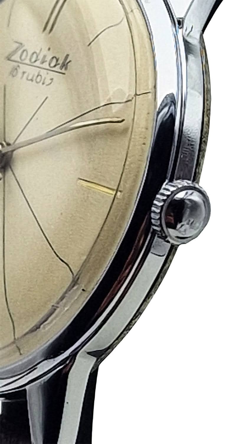 Tarcza ma srebrny kolor z delikatnym satynowym połyskiem i promienistym szlifem, który nadaje jej elegancji oraz głębi. Złocone indeksy i napisy „Zodiak”, „16 rubis” oraz „Made in Poland” tworzą klasyczną, czytelną kompozycję w duchu lat 60. Całość została profesjonalnie odnowiona w naszej pracowni, z zachowaniem oryginalnego układu i proporcji detali.