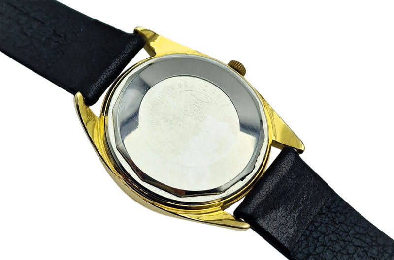 Koperta zegarka została wykonana z mosiądzu pokrytego grubą warstwą złocenia (Plaque G20), co zapewnia jej elegancki wygląd mimo upływu lat. Ma klasyczne proporcje 34,8 mm średnicy bez koronki i 42,4 mm wysokości z uszami dzięki czemu dobrze układa się na nadgarstku. Oryginalny, zakręcany dekiel ze stali nierdzewnej zdobi tłoczony emblemat z maltańskim krzyżem i informacjami o wodoodporności, wstrząsoodporności i szwajcarskim pochodzeniu.