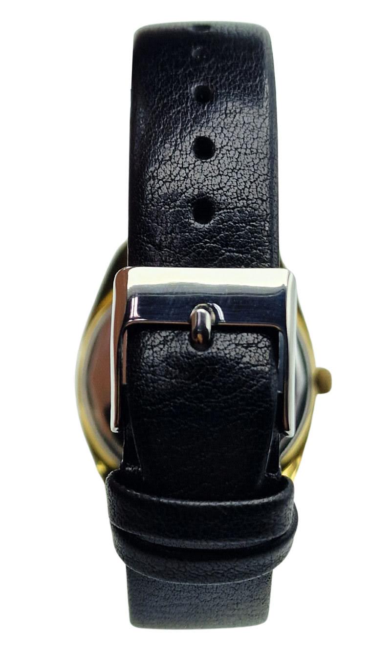 Zegarek wyposażono w pasek w kolorze czarnym, wykonany z wysokogatunkowej skóry naturalnej, który zapewnia wygodę noszenia i podkreśla klasyczny charakter modelu. Zapięcie w kolorze złotym idealnie komponuje się z kopertą, tworząc spójną całość. Maksymalny obwód nadgarstka (pasek + zegarek) to 20,5 cm, a szerokość przy mocowaniu wynosi 18 mm.