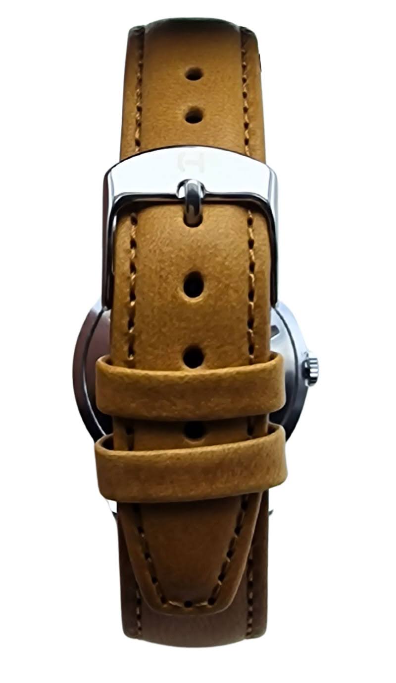 Pasek wykonano z brązowej skóry naturalnej o gładkiej fakturze, która idealnie komponuje się z klasycznym charakterem czasomierza. Starannie wykonane przeszycie wzdłuż krawędzi dodaje mu elegancji i trwałości, podkreślając rzemieślniczy styl vintage. Pasek zakończony jest stalową, polerowaną klamerką, a jego szerokość wynosi 18 mm, przy maksymalnym obwodzie 22,5 cm, co zapewnia wygodne dopasowanie do nadgarstka.