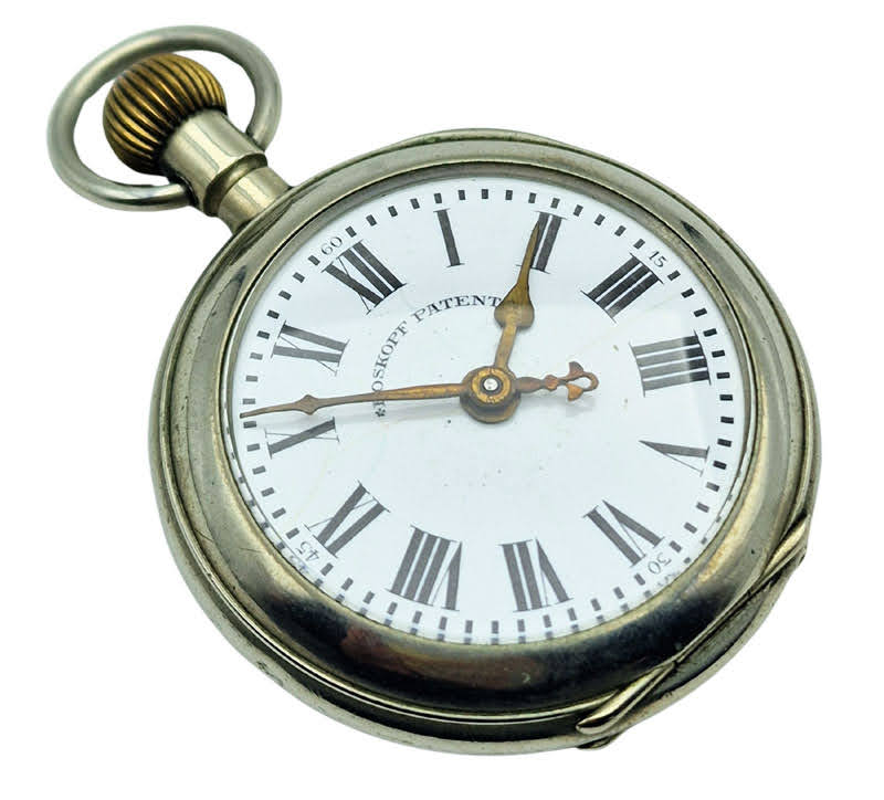 Koperta zegarka została wykonana ze stali o polerowanym wykończeniu, co zapewnia jej trwałość i odporność na uszkodzenia. Na deklu widnieje tłoczony napis „Roskopf Patent” oraz numer seryjny (193544), potwierdzający autentyczność modelu. Na szczycie koperty umieszczono złoconą, żebrowaną koronkę z uchwytem na dewizkę, typową dla klasycznych zegarków kieszonkowych z początku XX wieku.