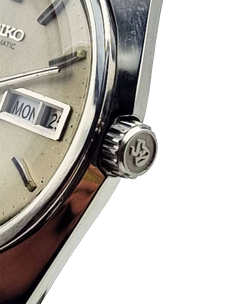 - Logo: nakładane, metalowe SEIKO z napisem AUTOMATIC poniżej - typowa stylistyka dla automatów marki z przełomu lat 60/70.