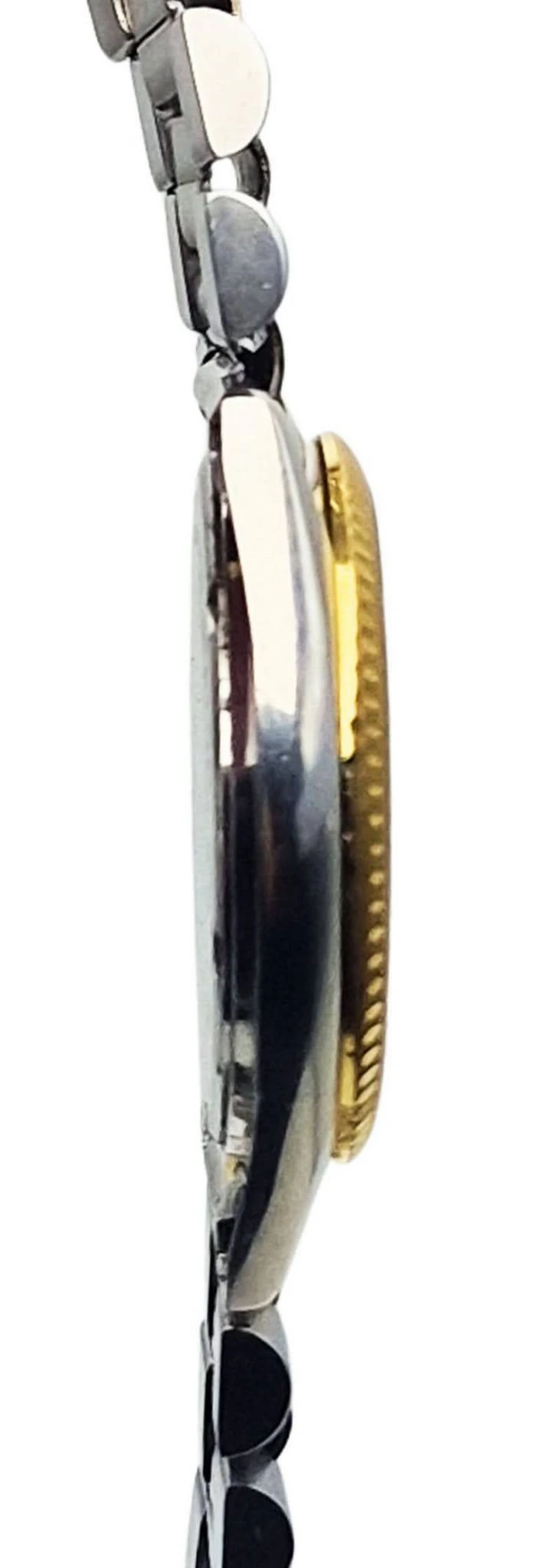 - Materiał: stal nierdzewna w dwukolorowym wykończeniu, łącząca srebrne i złote elementy.