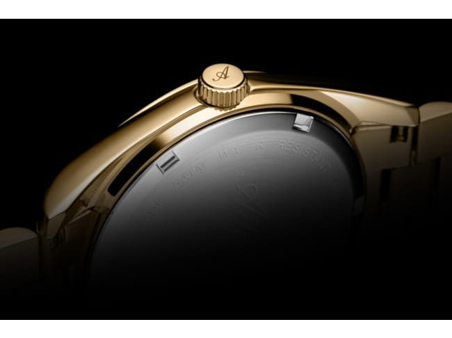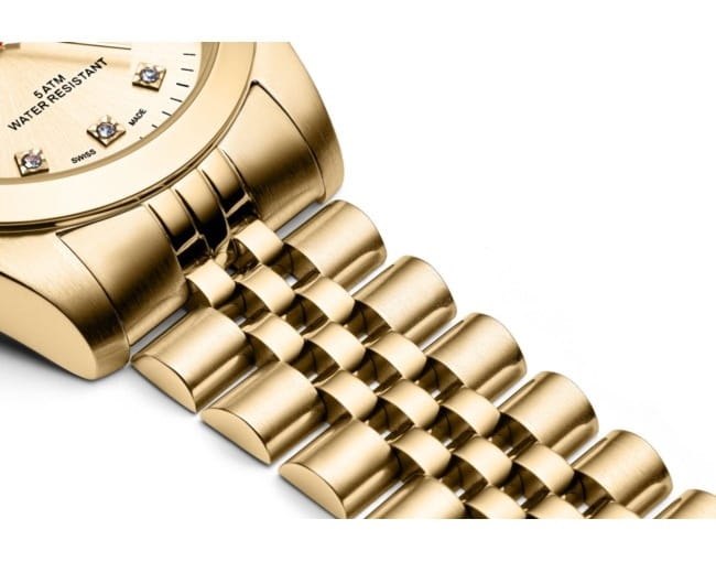 Złota tarcza z indeksami w formie cyrkonii dodaje zegarkowi luksusowego charakteru i subtelnego blasku.
