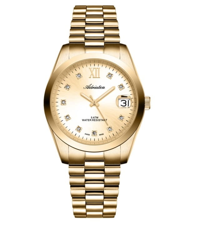 Adriatica A3199.1181Q to elegancki zegarek damski, który łączy w sobie klasyczny design z nowoczesnymi funkcjami. Koperta o średnicy 36 mm i grubości 9 mm wykonana jest z wysokiej jakości stali nierdzewnej pokrytej powłoką PVD w kolorze złotym, co zapewnia trwałość i odporność na korozję. Złota tarcza ozdobiona cyrkoniami pełni rolę indeksów godzinowych, dodając blasku i wyrafinowania. Na godzinie trzeciej umieszczono datownik z powiększeniem, ułatwiający odczyt aktualnej daty.Zegarek wyposażony jest w szwajcarski mechanizm kwarcowy Ronda 515, znany z precyzji i niezawodności. Szkło mineralne z powłoką szafirową chroni tarczę przed zarysowaniami i uszkodzeniami mechanicznymi. Bransoleta wykonana ze stali szlachetnej w kolorze złotym posiada standardowe zapięcie z zabezpieczeniem, zapewniając komfort i bezpieczeństwo noszenia.