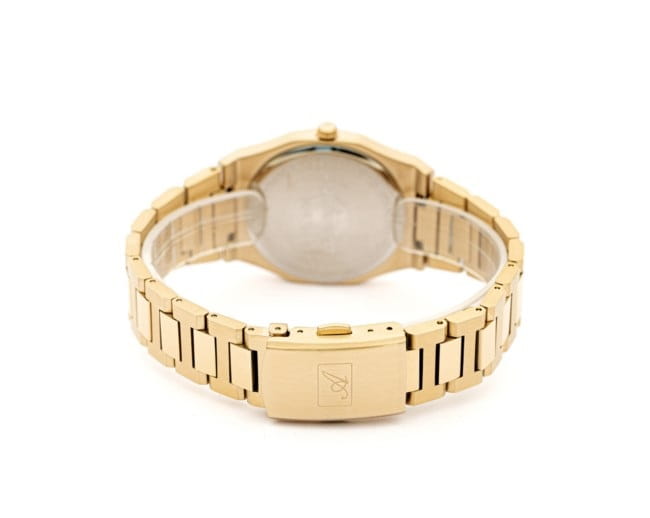 Koperta o średnicy 34 mm, wykonana z wysokiej jakości stali nierdzewnej w kolorze złotym, zapewnia luksusowy wygląd.