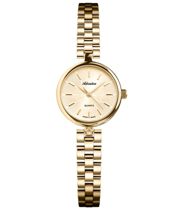 Damski zegarek Adriatica A3474.1113Q to elegancka i uniwersalna propozycja dla kobiet ceniących delikatne, klasyczne dodatki. Złocona koperta o średnicy 26 mm doskonale prezentuje się na nadgarstku, a minimalistyczna tarcza podkreśla jego ponadczasowy charakter.