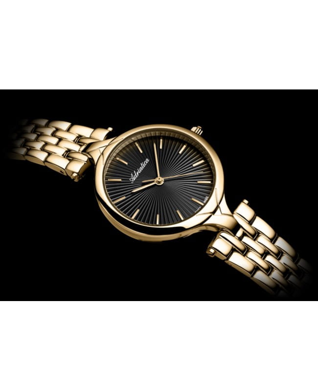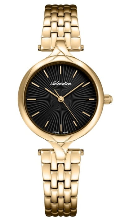 Adriatica A3825.1114Q to subtelny, damski zegarek o eleganckim designie, który łączy w sobie szwajcarską precyzję z klasycznym urokiem. Model ten został stworzony z myślą o kobietach ceniących styl, prostotę i ponadczasowe dodatki. Sercem zegarka jest niezawodny mechanizm kwarcowy Ronda 763 Swiss Made, który gwarantuje dokładność chodu i długoletnie działanie bez potrzeby częstej wymiany baterii. Koperta wykonana z wysokiej jakości stali szlachetnej pokryta jest powłoką w kolorze żółtego złota, co dodaje całości wyjątkowego szyku. Jej średnica wynosi 30 mm, a grubość zaledwie 7 mm – dzięki temu zegarek świetnie prezentuje się na smukłym nadgarstku. Czarna tarcza idealnie kontrastuje ze złotą kopertą, podkreślając luksusowy charakter czasomierza. Chroniona jest przez szkło mineralne, które dobrze zabezpiecza ją przed przypadkowymi zarysowaniami. Bransoleta również została wykonana ze stali szlachetnej w złotej barwie i ma szerokość 14 mm, co zapewnia komfort i stabilność podczas noszenia. Wodoszczelność na poziomie 3 ATM pozwala na podstawową ochronę przed wilgocią – nie straszny mu deszcz czy zachlapania. Adriatica A3825.1114Q to wyjątkowy dodatek do kobiecej garderoby – perfekcyjny na co dzień, jak i na wyjątkowe okazje.Główne zalety produktu