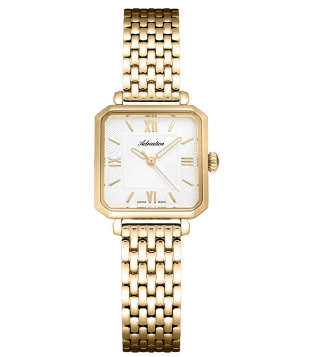 Adriatica A3839.1163Q to elegancki zegarek damski, który łączy w sobie klasykę i nowoczesne wykonanie charakterystyczne dla renomowanej szwajcarskiej marki Adriatica. Idealny wybór dla kobiet poszukujących minimalistycznej elegancji w codziennym dodatku – zarówno do pracy, jak i na wieczorne wyjścia.Zegarek został wyposażony w kwadratową stalową kopertę o rozmiarze 24 mm, która dzięki złotemu wykończeniu prezentuje się bardzo kobieco i ponadczasowo. Tarcza w kolorze srebrnym z delikatnymi indeksami godzinowymi i subtelnymi wskazówkami doskonale podkreśla lekkość formy. Całość chroni szkło mineralne – zapewniające ochronę oraz przejrzystość tarczy.