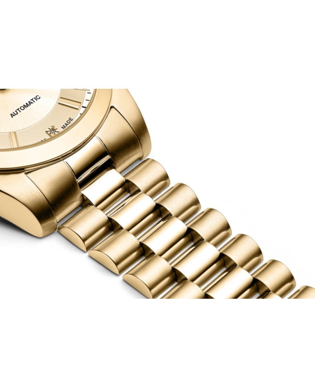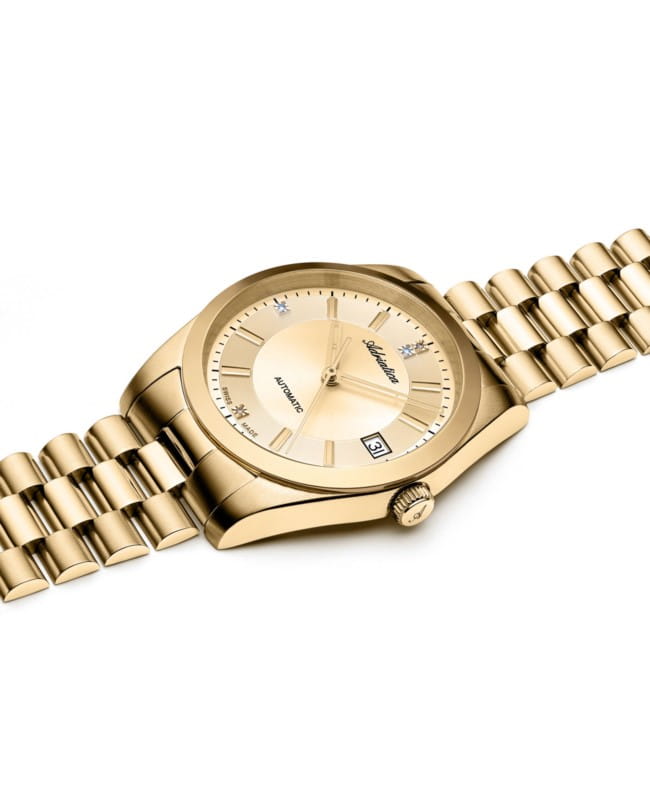 Tarcza w kolorze złotym o lekko połyskującym wykończeniu nadaje zegarkowi elegancki i ponadczasowy charakter. Cztery diamentowe indeksy w miejscu godzin dodają całości luksusowego sznytu. Okno datownika na godzinie 3 zwiększa funkcjonalność zegarka.