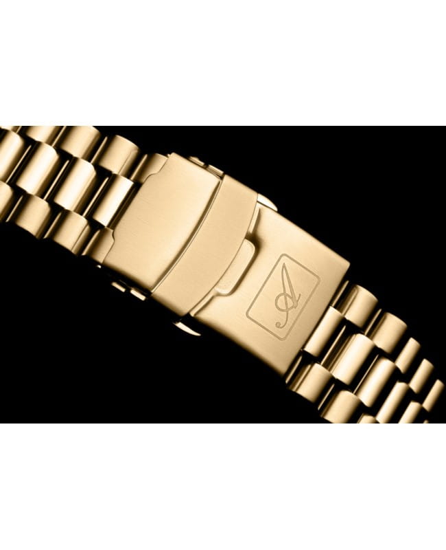 Zegarek dostępny jest z klasyczną bransoletą stalową pozłacaną. Szerokość mocowania wynosi 18 mm, co zapewnia stabilność na nadgarstku i dobre dopasowanie. Wersja ta oferuje wysoki komfort użytkowania i idealnie komponuje się z pozłacaną kopertą.
