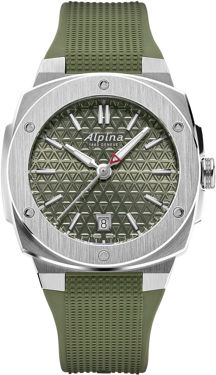 Alpina Alpiner Extreme Quartz AL-220K2AE6 Alpina Alpiner Extreme Quartz AL-220K2AE6 to zegarek zaprojektowany dla osób ceniących precyzję, wytrzymałość i elegancki design. Model ten wyróżnia się nowoczesnym wzornictwem i solidnym wykonaniem, co czyni go idealnym wyborem na co dzień oraz na specjalne okazje. Zegarek wyposażony jest w kwarcowy mechanizm Alpina AL-220, który zapewnia precyzyjne odmierzanie czasu oraz długi czas pracy baterii wynoszący aż 45 miesięcy. Mechanizm jest zamknięty w kopercie wykonanej z polerowanej i szczotkowanej stali nierdzewnej, o wymiarach 34 x 35,2 mm i grubości 8,35 mm. Koperta posiada antyrefleksyjne szafirowe szkło, które chroni tarczę przed zarysowaniami i zapewnia doskonałą czytelność. Zielona tarcza z wzorem trójkąta jest ozdobiona srebrnymi indeksami oraz polerowanymi wskazówkami z białą luminescencją, co gwarantuje czytelność w każdych warunkach oświetleniowych. Zegarek posiada także okienko datownika na godzinie 6 oraz charakterystyczny czerwony trójkąt na końcówce sekundnika. Cechy szczególne: