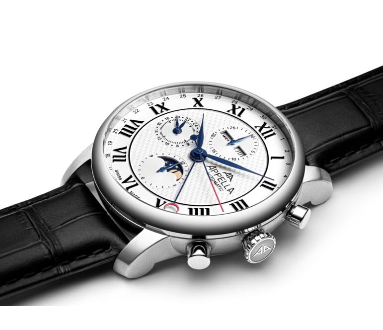 Appella L70010.5233ACHL to wielofunkcyjny zegarek z komplikacjami daty, dnia tygodnia, wskaźnikiem faz Księżyca, czasem 24-godzinnym oraz chronografem. Łączy klasyczną stylistykę z nowoczesną funkcjonalnością.