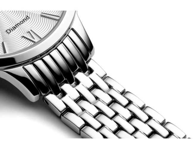 Tarcza w modelu Appella L50012.5163DQ została zaprojektowana z myślą o elegancji i przejrzystości. Jasne, srebrzyste tło z połyskiem pięknie odbija światło, a jeden subtelny diament dodaje jej wyjątkowego uroku. Smukłe, ażurowe wskazówki i indeksy batonowe zachowują klasyczny charakter i zapewniają doskonałą czytelność. Datownik umieszczony przy godzinie 3 został harmonijnie wkomponowany, nie zakłócając estetyki tarczy. Całość tworzy spójną kompozycję, łączącą minimalistyczny styl z nutą luksusu.
