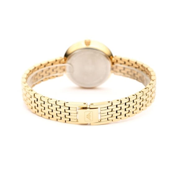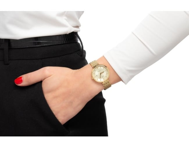 Bransoleta w kolorze złotym jest doskonale dopasowana do koperty, tworząc jednolitą, elegancką całość. Solidna konstrukcja ogniw zapewnia trwałość oraz wygodę codziennego noszenia. Zapięcie pozwala na szybkie i bezpieczne zakładanie oraz zdejmowanie zegarka. Dzięki regulacji długości można ją idealnie dopasować do nadgarstka. To element, który podkreśla biżuteryjny charakter modelu.