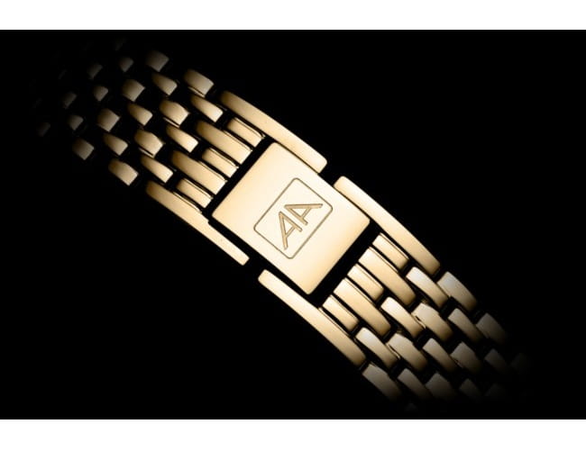 - Konstrukcja i dopasowanie: stalowa bransoleta w kolorze złotym, dobrana kolorystycznie do koperty. Ogniwa dobrze wykonane zapewniają stabilność oraz estetykę całości projektu.