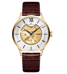 Appella L90.1B63SM Zegarek męski Appella L90.1B63SM to stylowy czasomierz łączący klasykę z nowoczesnym wykonaniem. Jego koperta wykonana jest ze stali nierdzewnej pokrytej powłoką PVD w kolorze złotym, a jej średnica wynosi 41 mm, co czyni zegarek idealnym wyborem dla miłośników eleganckiego designu. Zegarek posiada srebrną tarczę oraz ręcznie zdobiony mechanizm nakręcany Eta 7001, co zapewnia precyzyjne odmierzanie czasu. Szkło szafirowe z powłoką antyrefleksyjną chroni tarczę przed zarysowaniami i zapewnia doskonałą czytelność w różnych warunkach oświetleniowych. Detal który ma znaczenie Zegarek jest wyposażony w skórzany pasek z zapięciem typu motylkowego, co dodaje elegancji i komfortu noszenia. Tylna część koperty również pokryta jest szafirowym szkłem antyrefleksyjnym, co pozwala podziwiać ręcznie dekorowany mechanizm. Cechy szczególne: