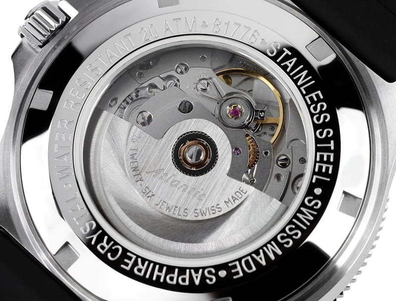 - Datownik i sygnowanie: Praktyczny datownik dopełnia układ funkcji bez zaburzania czytelności kompozycji. Logo Atlantic i oznaczenia techniczne są naniesione precyzyjnym drukiem, podkreślając szwajcarskie pochodzenie modelu.