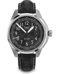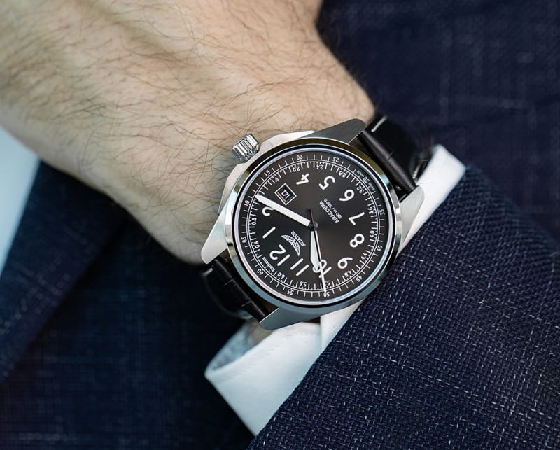 - Wygląd i czytelność: czarna tarcza z delikatnym szlifem słonecznym podkreśla głębię koloru i sprawia, że zegarek zmienia charakter wraz z padaniem światła. Układ „Type B” z zewnętrzną skalą minutową i wewnętrznym pierścieniem godzinowym zapewnia wzorową czytelność – to klasyka zegarków pilotowych, dopracowana pod kątem szybkiego odczytu.