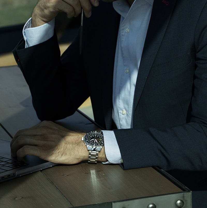- Materiał i forma: stal nierdzewna 316L łączy powierzchnie szczotkowane i polerowane, co podkreśla techniczny, lotniczy charakter modelu. Wyprofilowane uszy zapewniają stabilne ułożenie na nadgarstku i komfort noszenia na co dzień.