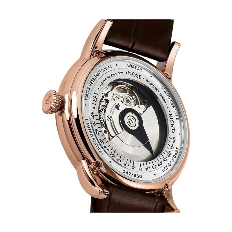 Koperta wykonana z wysokiej jakości stali nierdzewnej jest trwała i odporna na korozję. Jej okrągły kształt i precyzyjnie wykończone krawędzie nadają modelowi elegancki charakter. Zastosowana powłoka PVD w kolorze różowego złota zwiększa odporność na uszkodzenia, a proporcje koperty zapewniają wygodę noszenia i doskonałe dopasowanie. To konstrukcja, która łączy nowoczesność z klasycznym stylem, będąc wizytówką całej kolekcji Aviator.