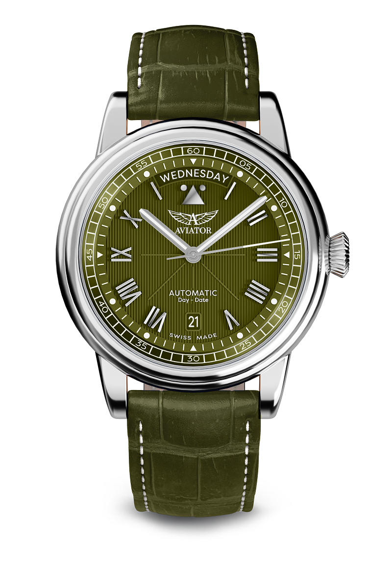 Aviator Douglas Day-Date 41 V.3.35.0.278.4 – limitowany uniwersalny automat day-date z zieloną tarczą i zielonym paskiem skórzanym.