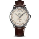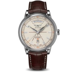 Aviator V.3.20.0.141.4, znany jako Douglas Day‑Date, to zegarek łączący ducha pilotażu z elegancją stylu art déco. Jego tarcza w kolorze ivory, pięknie odbija światło. Koperta o średnicy 45 mm z brązowym paskiem cielęcym podkreśla vintage’owy, męski charakter. Funkcja wskazywania dnia tygodnia i daty podnosi codzienną praktyczność modelu. To klasyka lotniczego designu w nowoczesnym wydaniu.
