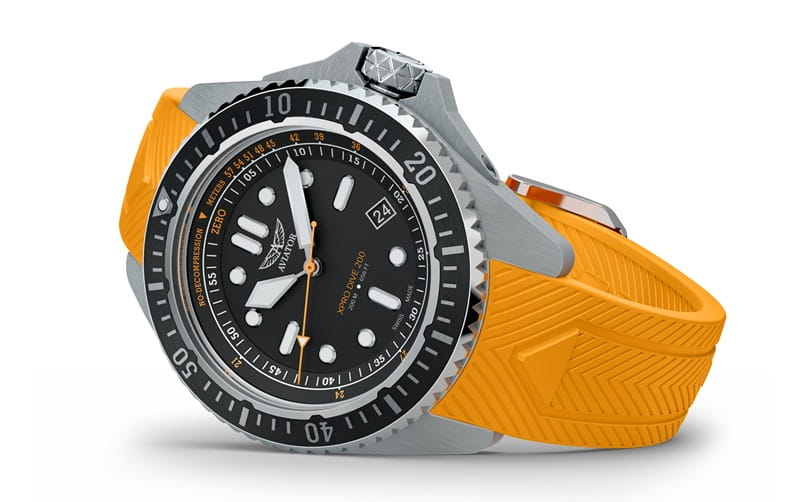 Aviator XPRO DIVE 200 V.1.42.0.371.0 – sportowy zegarek nurkowy z pomarańczowym paskiem i czytelną skalą NDL.