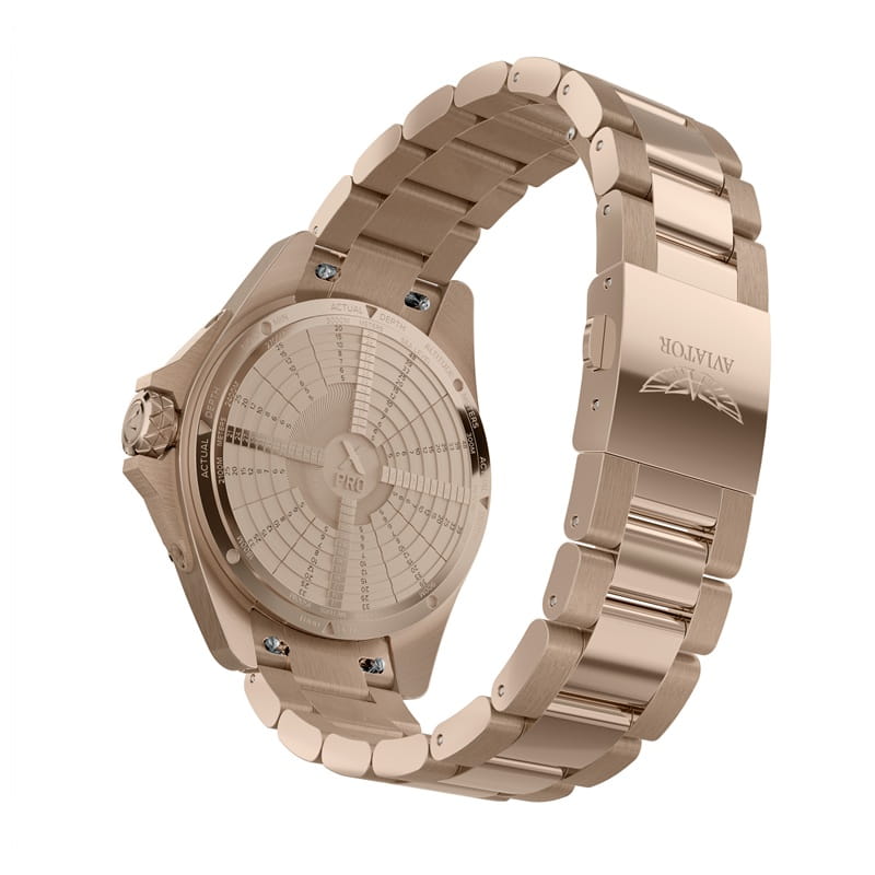 Aviator XPRO DIVER 200 V.1.42.2.373.5 – męski diver ze złoconą kopertą, czarną tarczą i stalową bransoletą PVD.