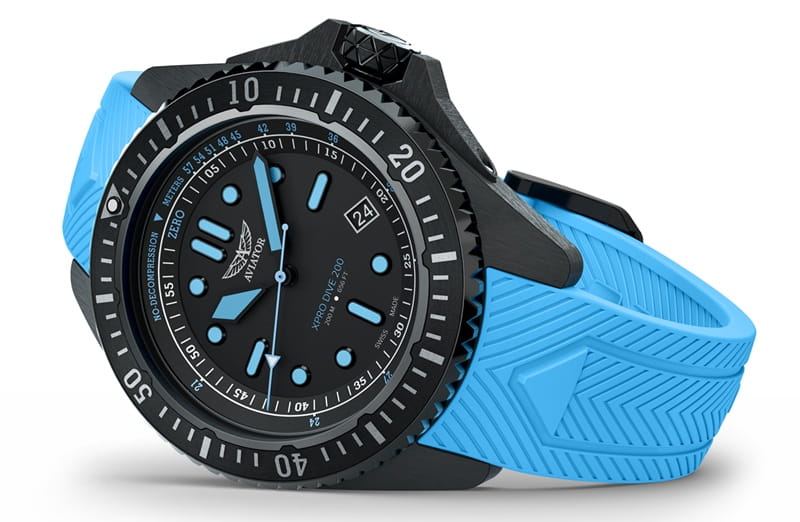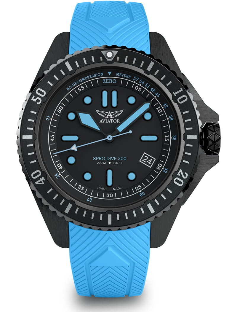 Aviator XPRO DIVE 200 V.1.42.5.377.0 – sportowy zegarek nurkowy z błękitnym paskiem i czytelną skalą NDL.