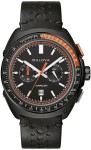 Czarna tarcza z kontrastującymi detalami i funkcjami chronografu, zapewniająca sportowy wygląd.