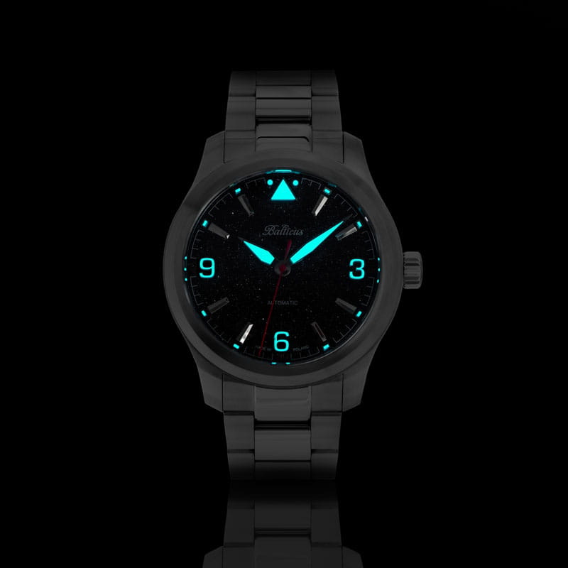 Tarcza zegarka została wykonana z naturalnego awenturynu, co nadaje jej unikalny, głęboki efekt przypominający rozgwieżdżone niebo. Indeksy i cyfry arabskie w kontrastowej barwie, pokryte warstwą luminescencyjną, zapewniają doskonałą czytelność zarówno w dzień, jak i w nocy. Całość uzupełnia smukła czerwona wskazówka sekundnika, która dodaje projektowi dynamiki i wyrazistego charakteru.
