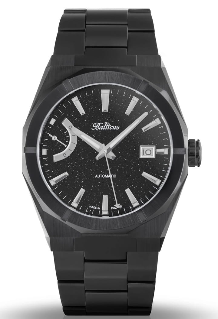 Balticus Gwiezdny Pył BALSDBPRBA to zegarek, który w subtelny sposób łączy astronomiczną symbolikę z precyzyjnym wykonaniem i luksusową estetyką. Czarna tarcza z naturalnego awenturynu mieni się niczym rozgwieżdżone niebo, dodatkowo czarna koperta i bransoleta nadają mu wyrafinowanego charakteru. To limitowana edycja 100 numerowanych egzemplarzy, zaprojektowana i składana w Polsce.