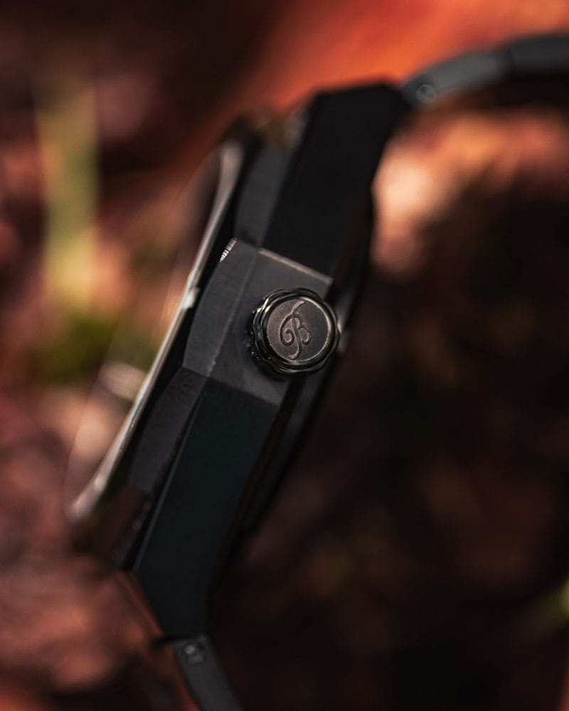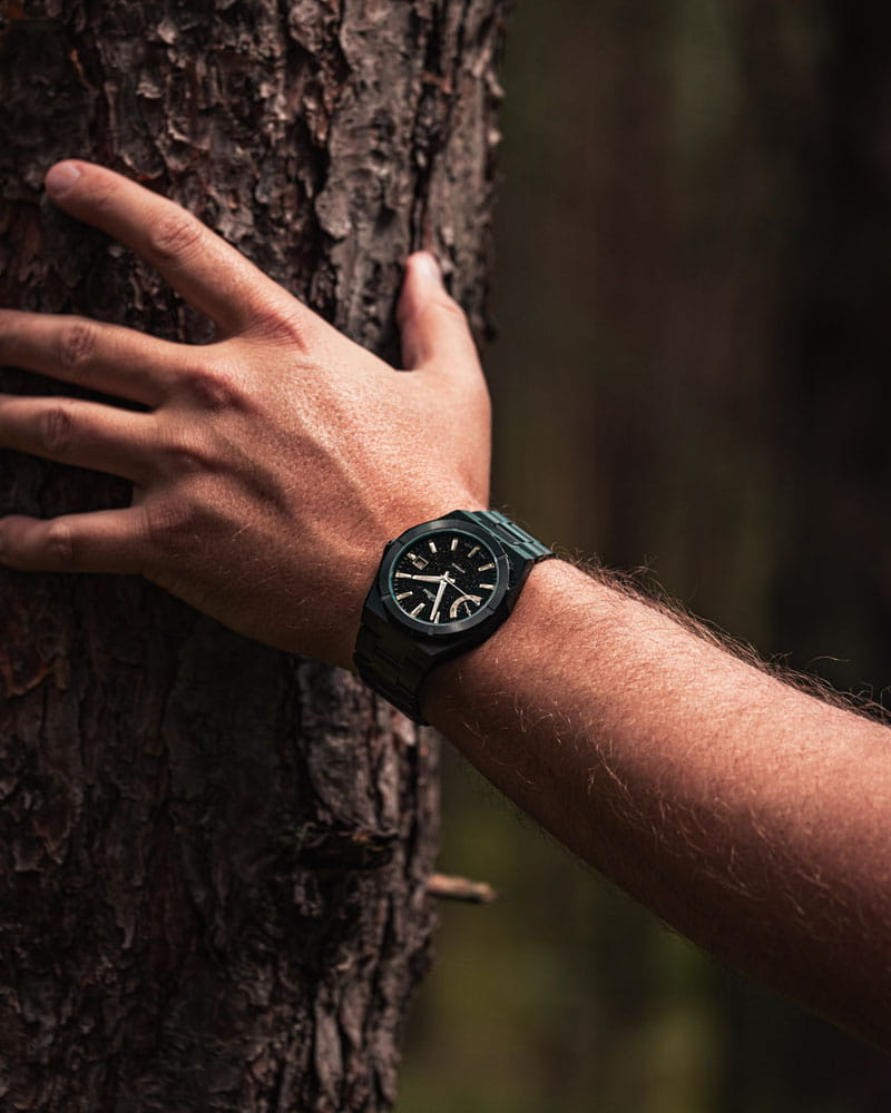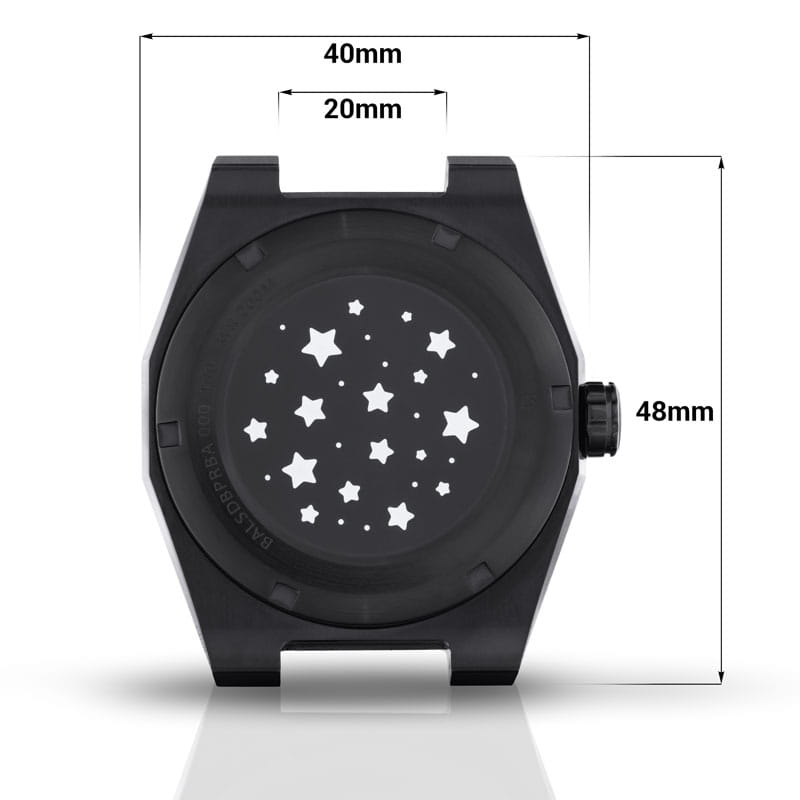 Koperta zegarka została wykonana z wysokiej jakości stali nierdzewnej 316L pokrytej czarną powłoką PVD, która nadaje całości luksusowego wyglądu i odporności na korozję. Jej średnica 40 mm i zakręcana koronka w połączeniu z szafirowym szkłem z antyrefleksem zapewniają komfort noszenia i wodoszczelność do 200 metrów.