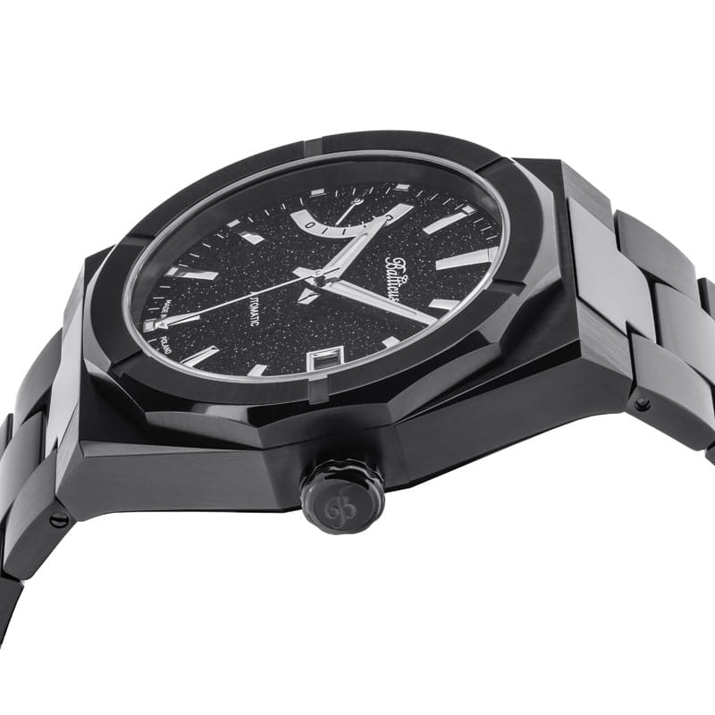 Tarcza zegarka została wykonana z naturalnego czarnego awenturynu, którego migocząca struktura przypomina rozgwieżdżone nocne niebo. Srebrne wskazówki, nakładane indeksy z luminescencją oraz wskaźnik rezerwy chodu i datownik nadają jej elegancji i funkcjonalnej głębi.