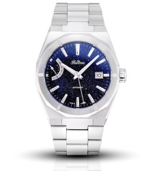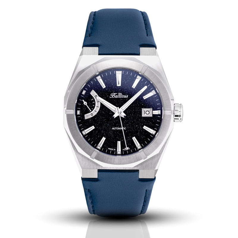 Tarcza wykonana z naturalnego niebieskiego awenturynu sprawia, że każdy egzemplarz jest unikatowy. Subtelny połysk mineralnych drobinek przypomina rozgwieżdżone niebo, a eleganckie indeksy i wskazówki z luminescencją zapewniają doskonałą czytelność zarówno w dzień, jak i w nocy.