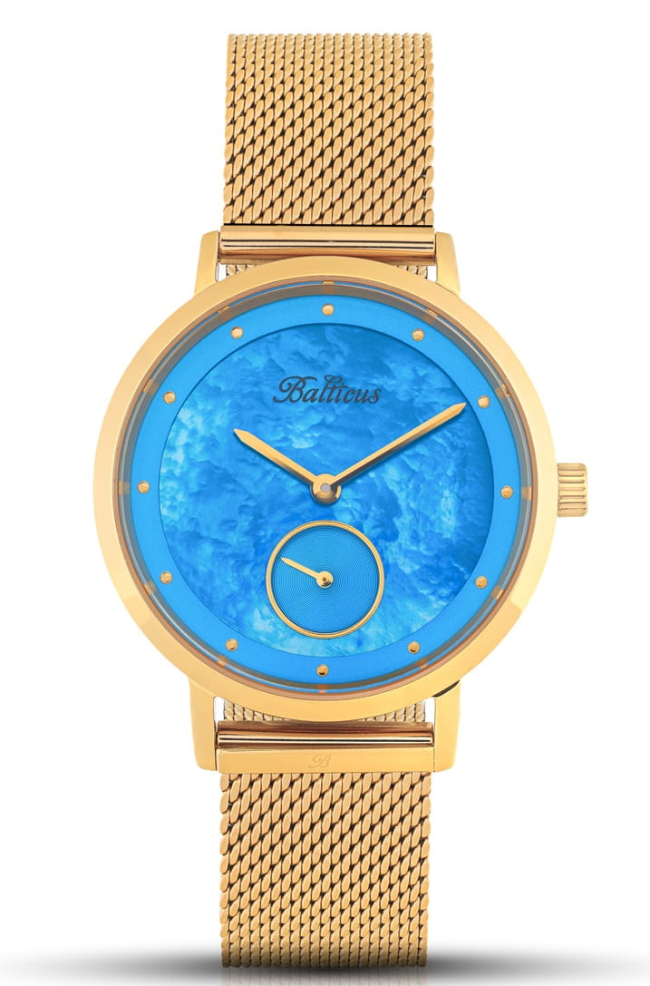 Zegarek Balticus New Sky Gold Blue Pearl to połączenie minimalistycznego designu z luksusowym wykończeniem, inspirowanym zmiennością nieba. To wyjątkowa propozycja dla kobiet ceniących elegancję, subtelność i niezawodność w jednym. Model ten łączy klasyczne wzornictwo z nowoczesnymi akcentami – jak modna, złocona bransoleta mesh i tarcza wykonana z masy perłowej. Całość zamknięta w okrągłej kopercie ze stali szlachetnej w kolorze złota sprawia wrażenie lekkiej, a zarazem niezwykle luksusowej.