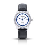 Tarcza wyróżnia się czystym, białym kolorem, który w połączeniu z niebieskimi akcentami nadaje zegarkowi świeżości i elegancji. Nakładane indeksy z powłoką Super-LumiNova gwarantują doskonałą czytelność zarówno w dzień, jak i w nocy. Całość dopełnia subtelny niebieski pierścień oraz datownik na godz. 3, które podkreślają harmonijny i funkcjonalny charakter kompozycji.
