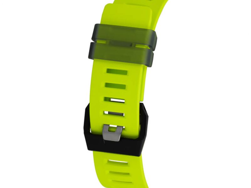 Pasek z elastycznej żywicy o szerokości 26 mm, odporny na pot, wodę i zmienne warunki pogodowe. Perforowana forma zwiększa wentylację podczas treningu.