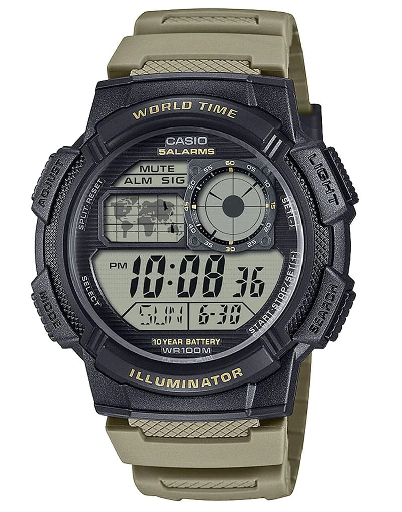 Casio AE-1000W-5AV to niezawodny towarzysz dla aktywnych osób, oferujący szereg funkcji w wytrzymałej i stylowej obudowie. ⌚