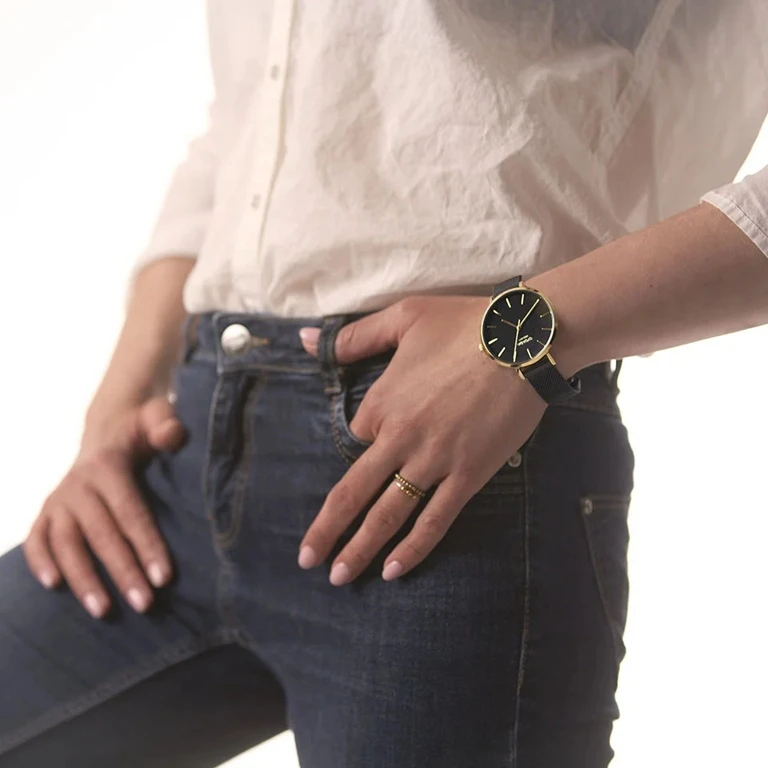 Czarna tarcza bardzo dobrze buduje elegancki i bardziej wyrazisty charakter tego modelu. Złote indeksy i wskazówki dodają całości subtelnej szlachetności oraz wzmacniają bardziej biżuteryjny kierunek stylistyczny. Kompozycja pozostaje estetyczna, kobieca i dobrze odnajduje się zarówno przy codziennych, jak i bardziej eleganckich stylizacjach. To wzornictwo minimalistyczne, ale nadal bardzo harmonijne. Tarcza stanowi jeden z najmocniejszych wizualnie elementów całego modelu.