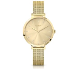 Model Cicada Milan Oro Breccia G34G04.G2 to elegancki zegarek damski utrzymany w ciepłej, nowoczesnej i bardzo kobiecej stylistyce. Złota tarcza zestawiona ze złotą kopertą i złotą bransoletą mesh tworzy spójną, efektowną kompozycję, która dobrze odnajduje się zarówno w codziennym noszeniu, jak i przy bardziej eleganckich okazjach. Delikatny blask kryształków Swarovski nadaje modelowi subtelnego biżuteryjnego charakteru, ale nie odbiera mu codziennej uniwersalności. Smukła koperta, minimalistyczny projekt tarczy i jednolita kolorystyka sprawiają, że zegarek prezentuje się bardzo harmonijnie i stylowo. To propozycja dla osoby, która szuka eleganckiego dodatku w wyraźnie złotej tonacji, ale nadal lekkiego i wygodnego na co dzień.