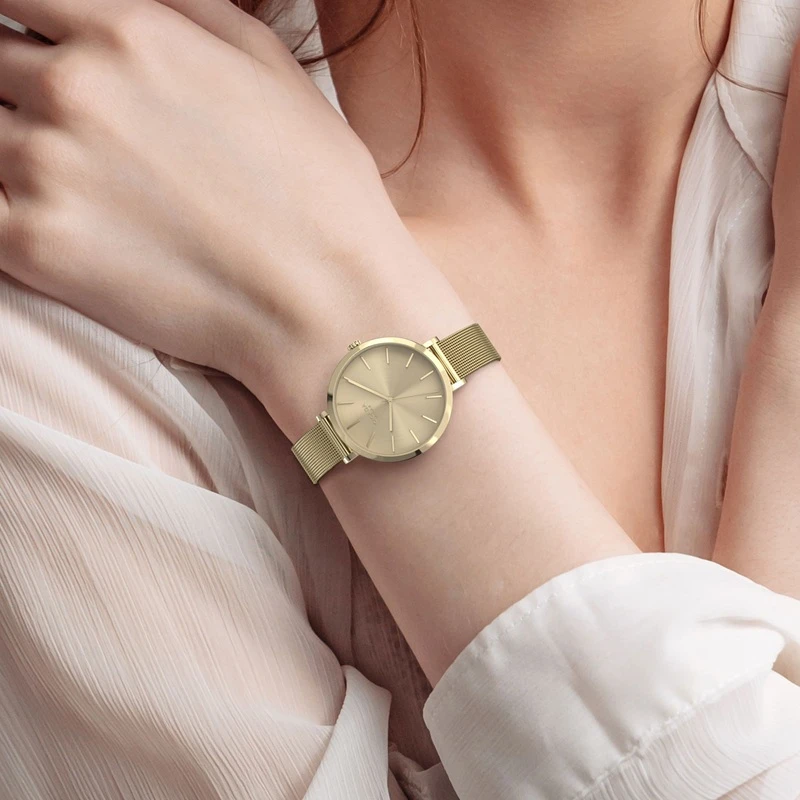 Model Cicada Milan Oro Liguria G34G04.GG to elegancki zegarek damski utrzymany w ciepłej, nowoczesnej i bardzo kobiecej stylistyce. Złota tarcza zestawiona ze złotą kopertą i złotą bransoletą mesh tworzy spójną, efektowną kompozycję, która dobrze odnajduje się zarówno w codziennym noszeniu, jak i przy bardziej eleganckich okazjach. Smukła koperta, minimalistyczny projekt tarczy i jednolita kolorystyka sprawiają, że zegarek prezentuje się bardzo harmonijnie i stylowo. To propozycja dla osoby, która szuka eleganckiego dodatku w wyraźnie złotej tonacji, ale nadal lekkiego i wygodnego na co dzień. Całość dobrze wpisuje się w charakter kolekcji Oro, stawiającej na ciepłe odcienie i subtelny, biżuteryjny odbiór.