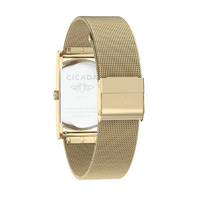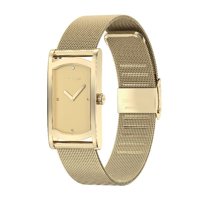 Cicada G20G06.G4 to elegancki zegarek damski inspirowany minimalistycznym stylem włoskiego designu. Model wyróżnia się współgrającą złotą tarczą ozdobioną kryształami Swarovski, które dodają mu biżuteryjnego charakteru. Złota koperta i delikatna bransoleta typu mesh tworzą bardzo elegancką i nowoczesną całość. Wewnątrz pracuje szwajcarski mechanizm kwarcowy Ronda, który zapewnia wysoką precyzję i niezawodność działania. Smukła koperta o grubości około 7 mm sprawia, że zegarek prezentuje się subtelnie i komfortowo układa się na nadgarstku. To doskonały wybór dla kobiet poszukujących eleganckiego dodatku do codziennych i bardziej formalnych stylizacji.