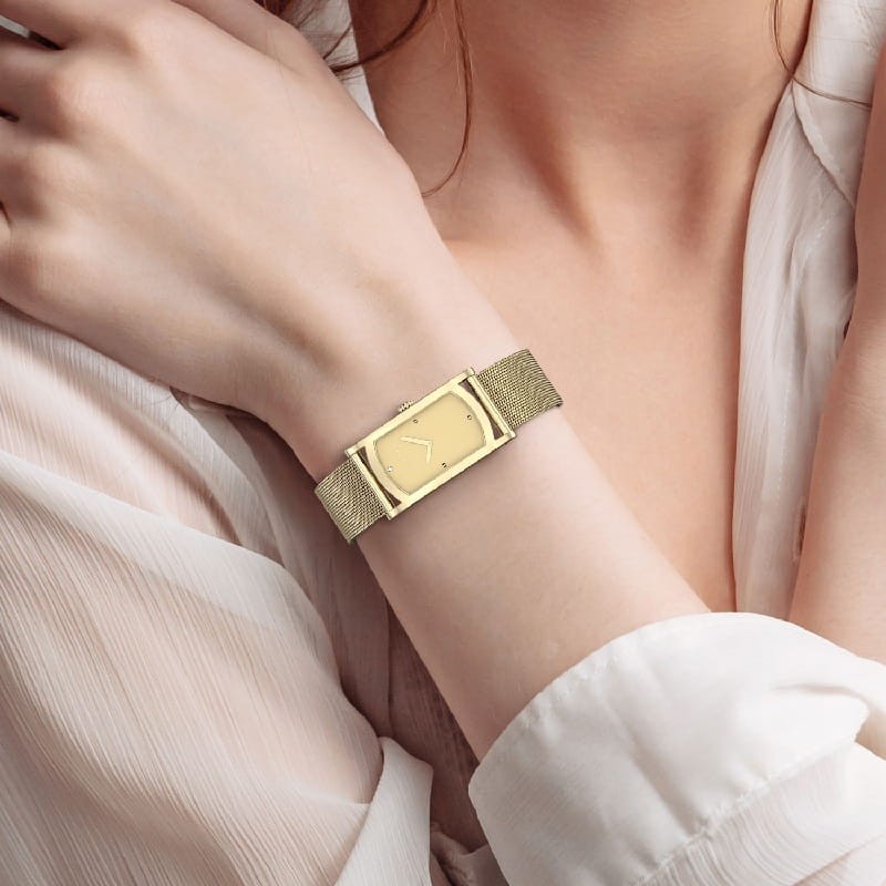 Złota tarcza ozdobiona kryształami Swarovski nadaje zegarkowi elegancki i biżuteryjny charakter. Minimalistyczny projekt sprawia, że zegarek pozostaje czytelny i stylowy. Złote wskazówki tworzą kontrast z tarczą i ułatwiają odczyt czasu.