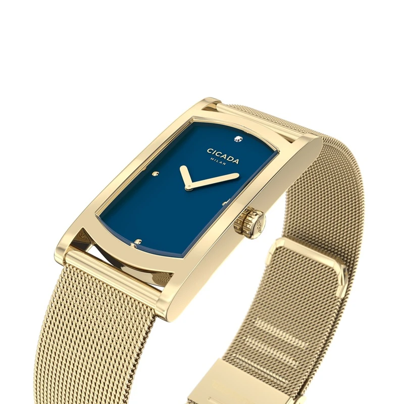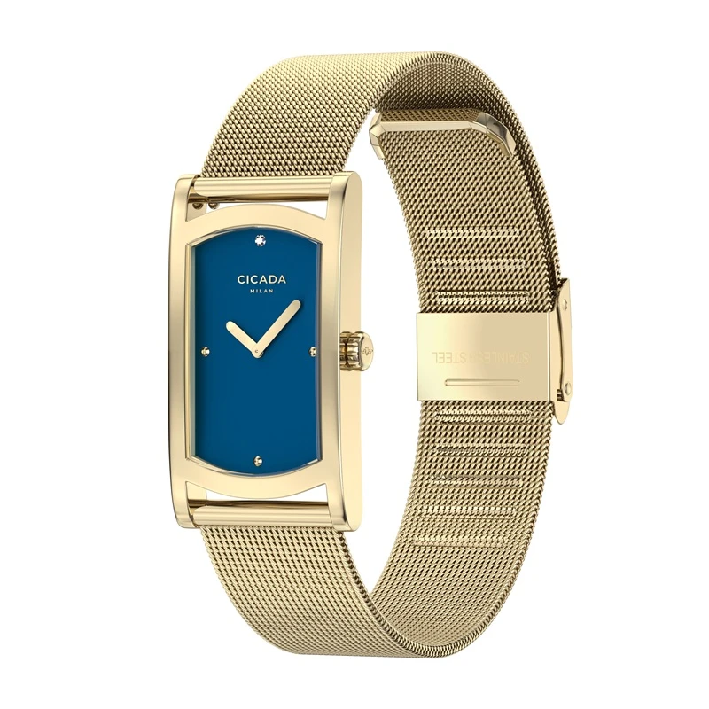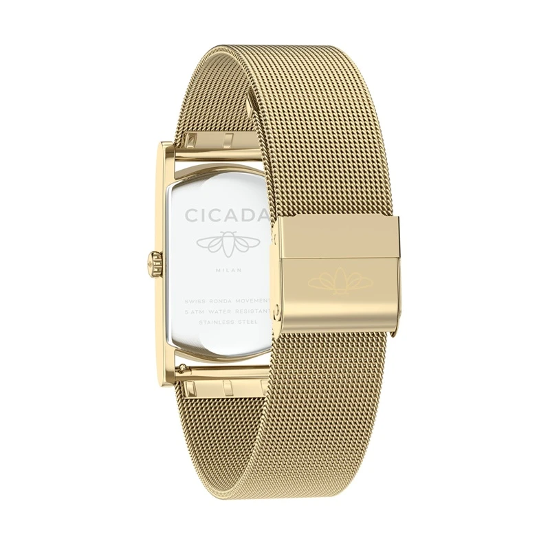 Zegarek należy do włoskiej marki Cicada Milano, która stawia na lekkość formy, estetyczną delikatność i nowoczesną elegancję. W dostępnych źródłach potwierdzona jest stalowa koperta, żółty kolor koperty oraz obecność kryształów SW. Pełna techniczna specyfikacja tego wariantu nie jest tak szczegółowo opisana jak przy innych modelach Cicady, dlatego część opisu zachowuje ostrożniejszy charakter.