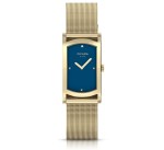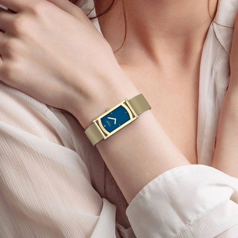 Stalowa koperta o wymiarach 36 × 20 mm i grubości 7 mm nadaje zegarkowi lekkie, zgrabne i bardzo kobiece proporcje. Złote wykończenie dodatkowo podkreśla elegancki, ozdobny charakter modelu, ale nadal pozostawia go w granicach subtelnej estetyki. Smukła, bardziej geometryczna forma sprawia, że zegarek prezentuje się nowocześnie i nie wydaje się ciężki wizualnie. Dzięki temu model wyróżnia się na tle bardziej klasycznych, miękkich wizualnie wariantów.