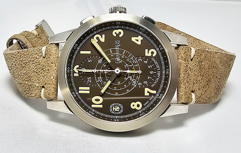 Tarcza zegarka utrzymana jest w głębokim brązie, inspirowanym kolorem kasku Tazio Nuvolariego, co nadaje całości wyjątkowego, vintage’owego charakteru. Duże arabskie cyfry oraz wskazówki z masą luminescencyjną w stylu retro zapewniają doskonałą czytelność zarówno w dzień, jak i w nocy. Spiralna skala tachymetryczna umieszczona w centrum tarczy oraz subtarczki chronografu podkreślają sportowy rodowód modelu, nawiązując bezpośrednio do świata wyścigów samochodowych.