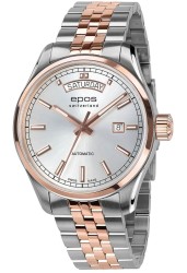 Epos 3501.142.34.98.44 Zegarek męski Epos 3501.142.34.98.44 to stylowy i funkcjonalny czasomierz, łączący nowoczesny design z tradycyjnym szwajcarskim rzemiosłem zegarmistrzowskim. Wykonany ze stali nierdzewnej i pokryty różowym złotem (PVD), zegarek przyciąga uwagę dzięki eleganckiej kolorystyce stali i różowego złota, która znajduje swoje odzwierciedlenie zarówno w kopercie, jak i bransolecie. Model ten napędzany jest automatycznym mechanizmem SW240, który oferuje funkcję dnia tygodnia i daty, a jego dekorowane wykonanie można podziwiać przez przezroczysty dekiel. Zegarek ma średnicę 41 mm oraz grubość 10,5 mm, co sprawia, że doskonale układa się na nadgarstku. Srebrna tarcza z wykończeniem sunray podkreśla elegancki charakter zegarka, a naniesione indeksy ułatwiają odczyt czasu, dodając mu klasy. Szkło szafirowe, odporne na zarysowania, zapewnia długotrwałą ochronę i doskonałą widoczność tarczy. Zegarek jest wyposażony w wodoszczelność na poziomie 10 ATM, co pozwala na bezpieczne użytkowanie w codziennych sytuacjach, a także podczas pływania. Zegarek posiada stalową bransoletę z elementami różowego złota i zapięcie na bezpieczną klamrę, co zapewnia komfort i pewność noszenia. Główne zalety produktu: