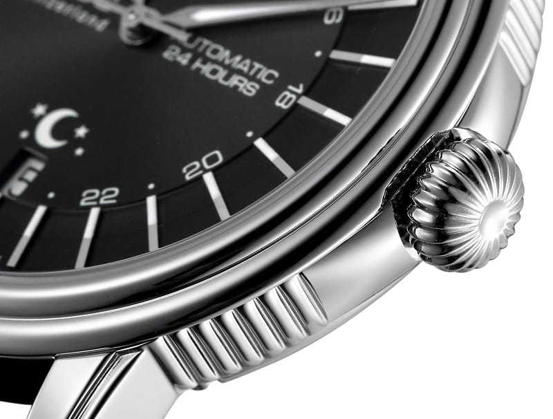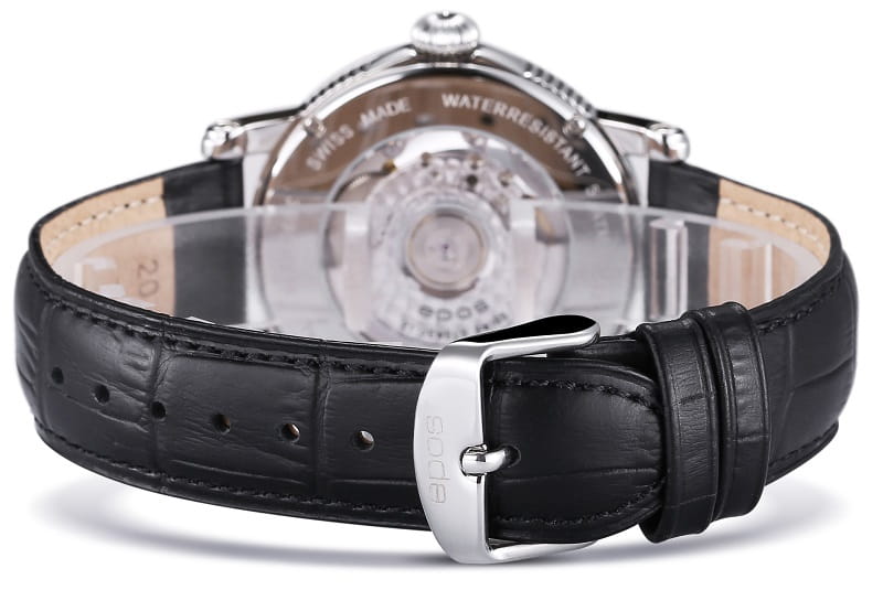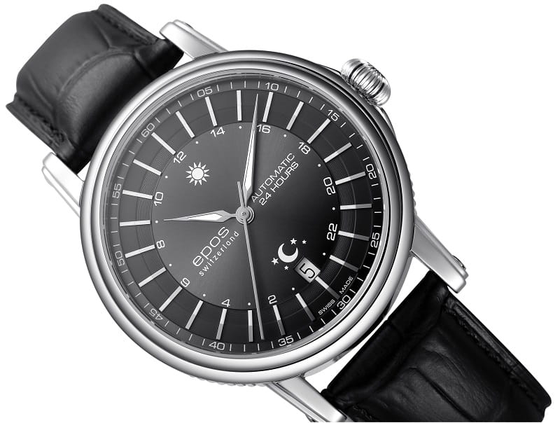 Epos Emotion 3390.302.20.14.25 Zegarek męski Epos Emotion 3390.302.20.14.25 to wyrafinowany wybór dla miłośników precyzyjnego zegarmistrzostwa i elegancji. Zegarek ten zachwyca swoją 24-godzinną tarczą oraz wysokiej jakości wykonaniem, co czyni go nie tylko funkcjonalnym, ale i stylowym dodatkiem do codziennej garderoby. Model ten jest wyposażony w automatyczny mechanizm Swiss ETA 2892-A2, który został specjalnie zmodyfikowany do wyświetlania czasu w formacie 24-godzinnym. To unikatowe rozwiązanie pozwala na jednorazowe okrążenie całej tarczy przez wskazówkę godzinową w ciągu doby, co dodaje zegarkowi wyjątkowego charakteru. Epos Emotion to zegarek z kopertą o średnicy 41 mm, wykonaną ze stali nierdzewnej, oraz tarczą w kolorze czarnym z analogowym wyświetlaczem. Całość jest chroniona przez szafirowe szkło antyrefleksyjne, które gwarantuje odporność na zarysowania i doskonałą widoczność tarczy w każdych warunkach. Detal, który ma znaczenie Zegarek posiada przezroczysty dekiel, dzięki któremu można podziwiać precyzyjne działanie mechanizmu oraz jego eleganckie zdobienia. Pasek wykonany z wysokiej jakości skóry naturalnej w kolorze czarnym idealnie dopełnia klasyczny wygląd zegarka, zapewniając jednocześnie komfort noszenia. Cechy szczególne: